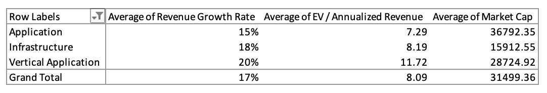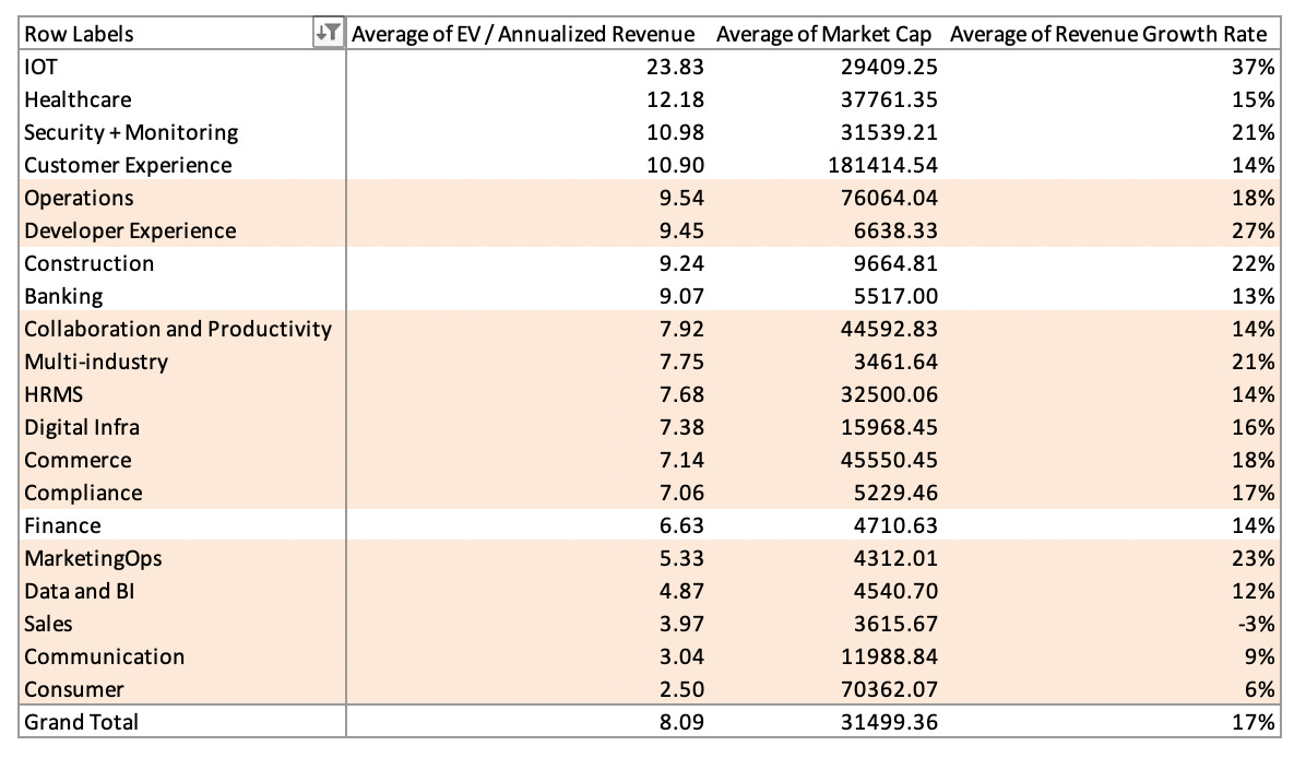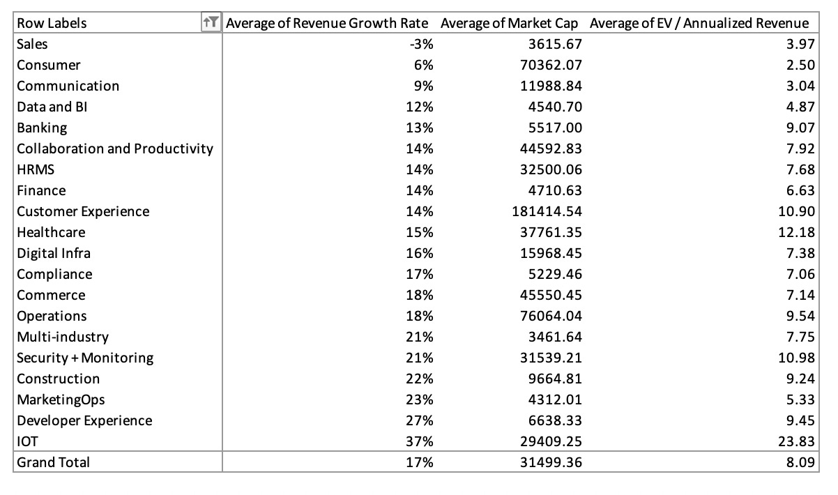 This prompted me to dig a little deeper into the public markets to see what is the view from the top. Are we seeing better growth in some sectors as compared to others? Has Alpha shifted from Horizontal Application plays to hyper specialised verticals? The next few passages will try to uncover these answers.